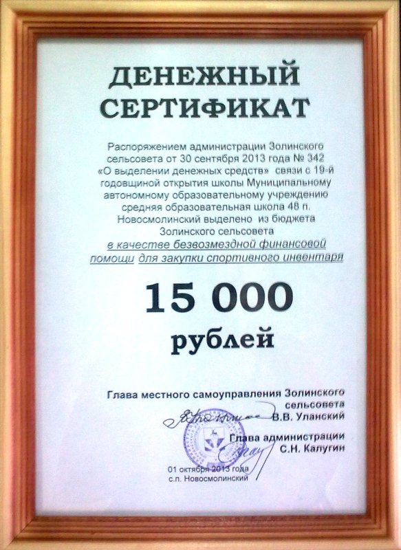 1 октября 2013 года- в День рождения школы- Глава местного самоуправления Золинского сельсовета Виктор Васильевич Уланский подарил нам сертификат на 15 000 рублей на приобретение такого нужного спортивного инвентаря для уроков и занятий физической культурой. 30 волейбольных, 20 баскетбольных, 9 футбольных и 9 теннисных мячей уже накачаны и ждут своего часа! Педагогический коллектив и обучающиеся МАОУ СОШ № 48 благодарят Виктора Васильевича Уланского и главу администрации Золинского сельсовета Сергея Николаевича Калугина за поддержку в организации спортивной и оздоровительной работы среди подрастающего поколения. Спасибо!