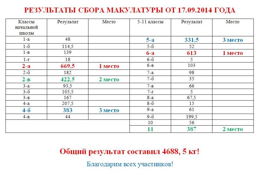 17 сентября 2014 года в рамках акции «Спаси дерево!» состоялся традиционный осенний сбор макулатуры. Все обучающиеся и родители приняли активное участие в сборе старых газет, журналов, картона. Лучшими в школе стали ученики 2-а класса (классный руководитель Лидия Анатольевна Барскова). Их результат – 669 килограммов и 500 граммов. Среди 5-11 классов победу одержал 6-а класс (классный руководитель Татьяна Анатольевна Коптелова): ребята собрали 613 килограммов макулатуры. Общий итог сбора- 4688 килограммов 500 граммов! Переработанная макулатура позволит спасти от вырубки 46 деревьев. Акция «Спаси дерево!» будет продолжена весной.