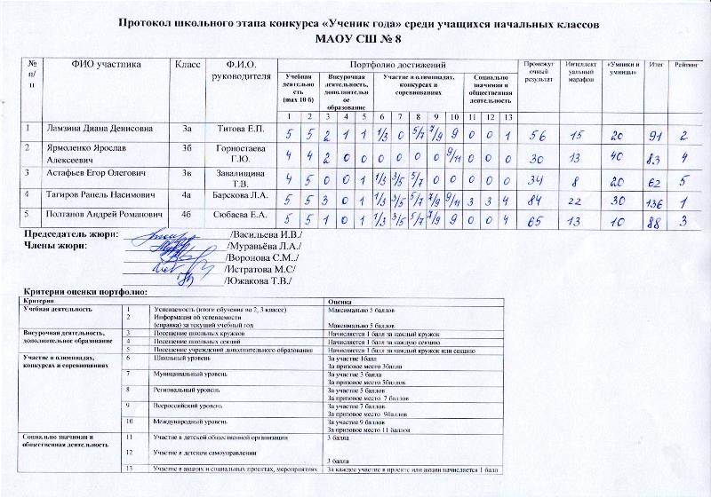 4 апреля 2017 года в МАОУ СШ№8 состоялся школьный этап муниципального конкурса «Ученик года в начальной школе-2017». Лучшие обучающиеся 3-4 классов, прошедшие внутриклассный отбор, представили жюри свое портфолио, соревнуясь между собой в достижениях учебной и внеурочной деятельности, участию в олимпиадах, конкурсах, соревнованиях, социально значимой и общественной деятельности. Ребята прошли тестирование и интеллектуальную игру, посвященную Году экологии в России. Каждый участник достойно представил свои знания, показал творческие способности и умение найти выход в сложной ситуации. По результатам всех испытаний победу одержал обучающийся 4-а класса Ранель Тагиров, на втором месте Диана Ламзина (3-а класс), третье место у Андрея Полтанова (4-б класс), четвертым стал Ярослав Ярмоленко (3-б класс), Егор Астафьев (3-в класс) -пятый. Поздравляем Ранеля Тагирова и классного руководителя Лидию Анатольевну Барскову с победой и желаем удачи на муниципальном этапе конкурса!