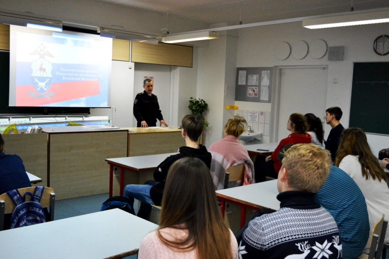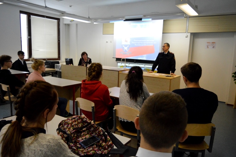 4 декабря 2018 года в МАОУ СШ№8 состоялась беседа представителя отдела МВД по Володарскому району со старшеклассниками. Мероприятие состоялось в рамках программы «Профориентация». Старший лейтенант внутренней службы Карпов Андрей Александрович, инспектор направления профессиональной подготовки отделения по работе с личным составом ОМВД России по Володарскому району подробно рассказал учащимся 10-11 классов о направлениях подготовки Нижегородской Академии Министерства внутренних дел Российской Федерации: правоохранительная деятельность, экономическая безопасность, юриспруденция, правовое обеспечение национальной безопасности. Особый интерес у ребят вызвали правила поступления, вступительные испытания, денежное довольствие. В заключение учеников пригласили поучаствовать во всероссийской олимпиаде школьников «На страже экономики».