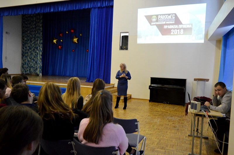 20 марта 2018 года в актовом зале МАОУ СШ№8 состоялась встреча обучающихся старших классов с представителями Дзержинского филиала РАНХИГС при Президенте Российской Федерации. Мероприятие было проведено в рамках программы «Абитуриент-2018» и имело профориентационную направленность. Ребятам рассказали о правилах поступления на базе среднего и общего образования, преимуществах обучения в Российской академии народного хозяйства и государственной службы. Пристальное внимание было обращено на востребованные специальности. В заключение будущих абитуриентов пригласили на День открытых дверей Дзержинского филиала РАНХИГС, который состоится 24 марта 2018 года.