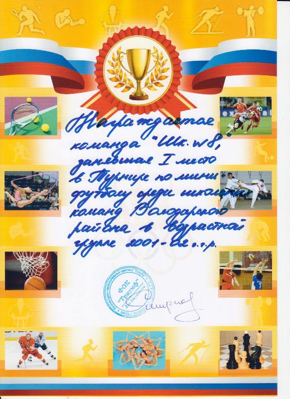 1 ноября 2018 года в ФОК «Триумф» г. Володарска состоялся турнир по мини-футболу. Состязания собрали лучших спортсменов общеобразовательных организаций Володарского муниципального района и проводились с целью оздоровления, популяризации массовых видов спорта среди подростков и молодежи. Две команды МАОУ СШ№8 в разных возрастных группах начали трудный путь к спортивной славе, и ребятам 2001-2002 г.р. удалось добиться успеха! Акмамедов Расул, Ефанов Владислав, Монотейкин Вадим, Ермаков Андрей, Струнин Олег сыграли дружно и мощно, став победителями турнира! Поздравляем нашу команду и руководителя Сергея Ивановича Соболева с победой! Желаем новых высот!
