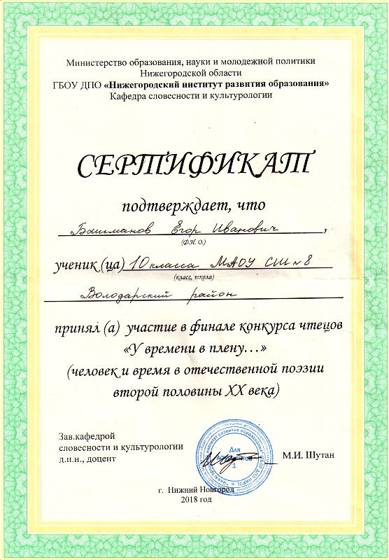 16 ноября 2018 года в Нижнем Новгороде состоялся областной конкурс чтецов "У времени в плену..." Конкурс проводился в рамках реализации государственной программы "Развитие образования в Нижегородской области" на 2018 год и плановый период 2019-2020 годов и был посвящён теме человека и времени в отечественной поэзии второй половины ХХ века. Организаторами Конкурса стали министерство образования, науки и молодежной политики Нижегородской области и государственное бюджетное образовательное учреждение дополнительного профессионального образования "Нижегородский институт развития образования".