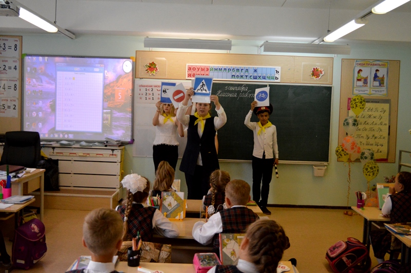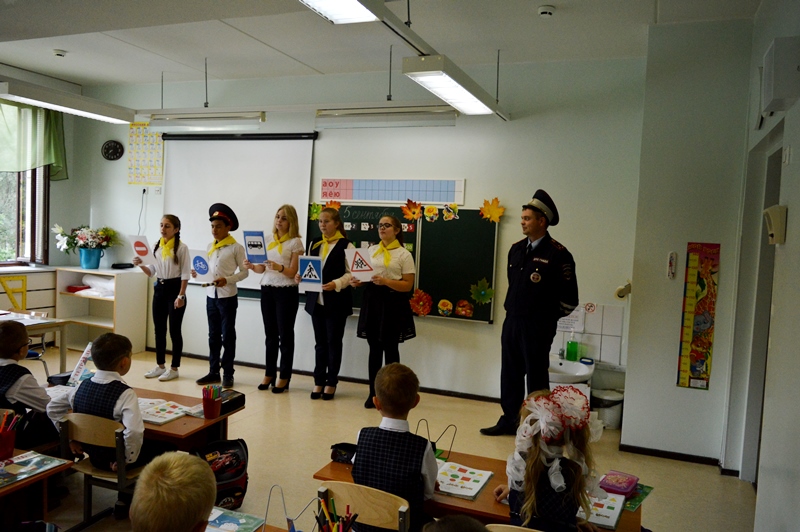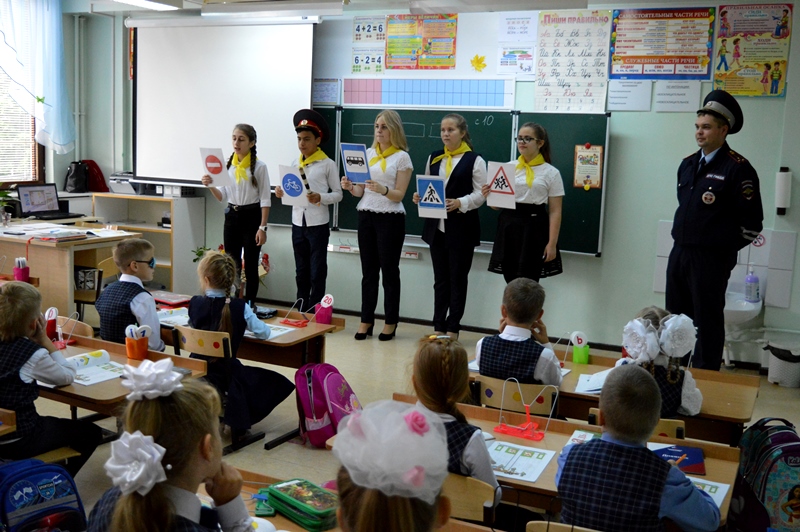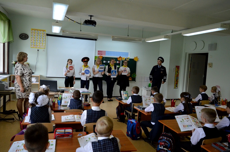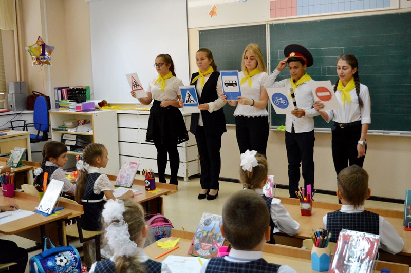 В первые дни сентября особенно важно обращать внимание детей на соблюдение правил дорожной безопасности. После яркого и шумного лета малыши забывают об элементарной осторожности и легко оказываются в аварийных и травмоопасных ситуациях на дороге. 5 сентября 2018 года во всех классах МАОУ СШ8 были проведены классные часы и беседы, посвященные правилам дорожного движения. Особенно повезло учащимся начальной школы: с познавательным выступлением их посетила агитбригада волонтерского отряда «Экватор» и инспектор ДПС Владимир Александрович Божко. Анастасия Павликова , Анна Павлушкова, Валерия Киселева, Алина Пашаян и Илгар Гасанов рассказали малышам о знаках на дороге и пожелали всем безопасного поведения.