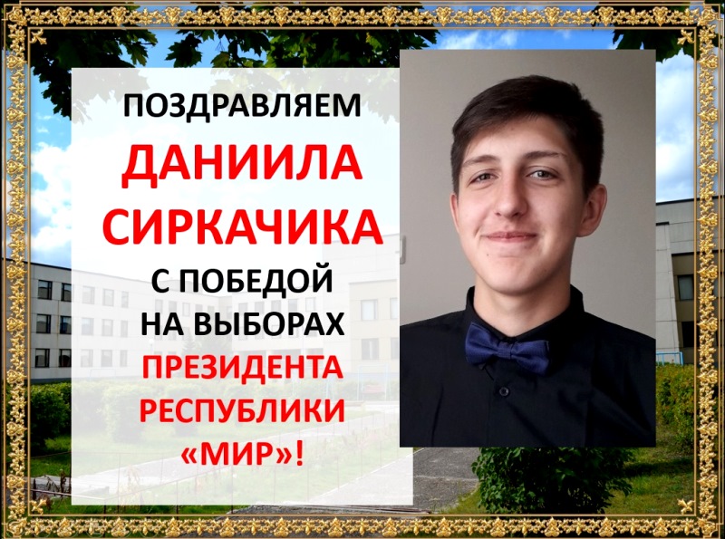 Наибольшее количество голосов было отдано за ученика 10 класса Даниила Сиркачика! Поздравляем избранного Президента «Республики «МИР»! Желаем дружной команды и отличных идей!