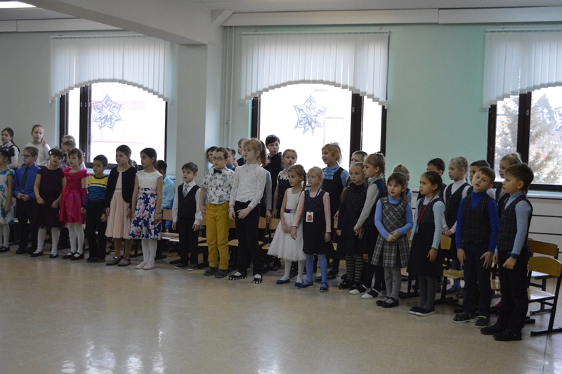 Ведущая (Маренкова Дарья – 7а класс) предложила всем зрителям очутиться в сказке, и посмотреть, как же лесные жители отмечают Новый год. Медведь (Сотина Марианна-4б класс), Лиса (Мясумова Диана – 4б класс), Зайка (Девришалиева Алиса – 3а класс), Мышка (Андреева Екатерина – 4а класс) спорили, что предстоящий 2020 год должен быть посвящен именно им. Но тут прилетела Сова и рассказала притчу, почему именно Мышь, должна стать символом года. Мышка начала радостно танцевать, веселиться, а остальные все равно не хотели соглашаться. Появление Снегурочки (Китаева Анастасия – 3а класс) угомонило всех лесных жителей, и они согласились, чтобы Мышка стала главной героиней Нового года. Вместе со Снегурочкой учащиеся 1-х классов спели песню «Ёлки, шарики, хлопушки», станцевали танец. Самым неожиданным было появление Деда Мороза (Поляков Кирилл – 7а класс) на самокате! Как ветер он пронесся, поздоровался с ребятами, спросил, о чем же мечтают и что желают они друг другу в Новом году.