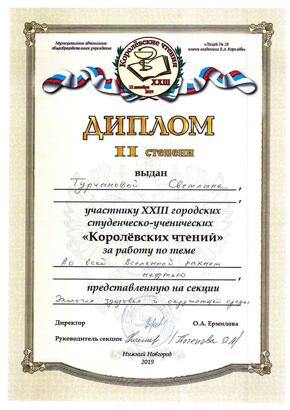 12 декабря 2019 года в МАОУ «Лицей №28 имени академика Б.А.Королёва» в Нижнем Новгороде состоялись XXII городские студенческо-ученические «Королёвские чтения». Учащаяся 11 класса МАОУ СШ№8 Турчанова Светлана представляла на защите свою исследовательскую работу "Во всей вселенной пахнет нефтью". Проект получил высокую оценку и был удостоен Диплома 2 степени! Так же Светлана получила приз зрительских симпатий за лучший доклад.