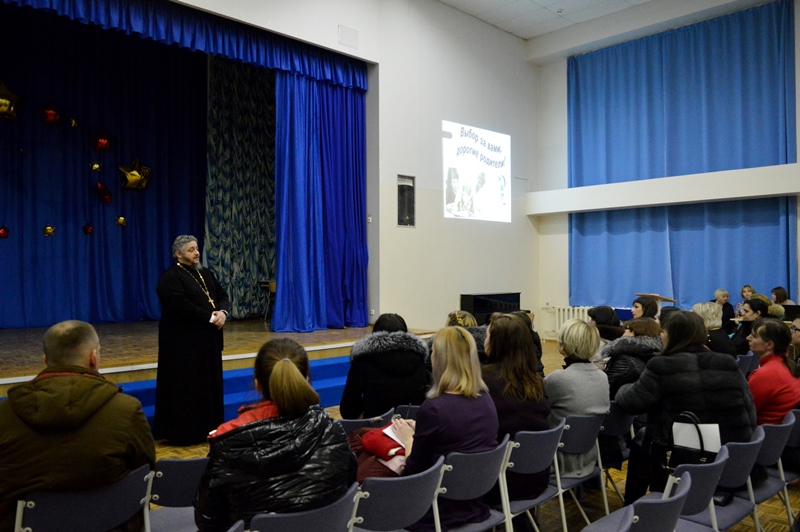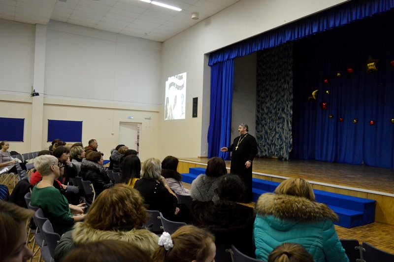 Собрание родителей и законных представителей учащихся 3-х классов «О выборе модуля курса «Основы религиозной культуры и светской этики» в 2019-2010 учебном году»открыла директор Ирина Владиславовна Васильева. Заместитель директора Лариса Александровна Муравьева рассказала участникам собрания о принципах построения обучения, целях и задачах курса ОРКСЭ, правилах оформления заявлений. Настоятель новосмолинского храма святого благоверного князя Александра Невского иерей Дмитрий попросил родителей ответственно отнестись к выбору модуля курса.