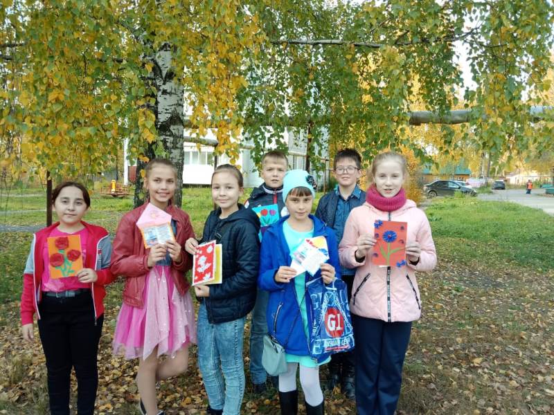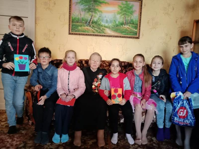 Волонтеры 5а и 5б класс: Долженко Анна, Лезина Дарья, Трунова Екатерина, Евстропов Илья, Соболев Даниил, Ибрагимова Равшана под руководством старшей вожатой Амельченко Екатерины Евгеньевны подготовили праздничную программу. Заранее договорившись о встрече, волонтеры после уроков отправились поздравлять уважаемых людей. Ветераны Волков Евгений Петрович (90 лет), Волкова Надежда Илларионовна (90 лет), Ермакова Таисия Ивановна (91 год), Генц Валентина Ивановна, Борчак-Попова Людмила Ивановна очень тепло приняли ребят, радовались их приходу и обнимали как своих родных внуков. На встрече волонтеры пели песни, читали стихи и подарили открытки, сделанные своими руками учащимися 3-х классов. Пожилые люди поделились воспоминаниями из своего детства и просили чаще к ним приходить.