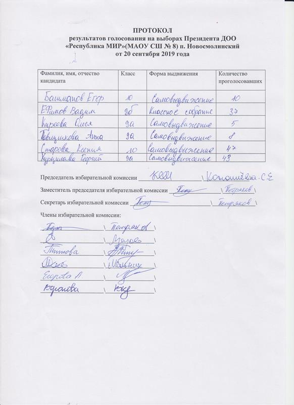 20 сентября 2019 года в МАОУ СШ№8 состоялись выборы Президента ДОО «Республика МИР». Шесть уверенных и активных претендентов на важный пост самостоятельно выдвинули свои кандидатуры: Башманов Егор -10класс, Ефимов Вадим – 9б класс, Киреева Олеся – 9а класс, Павлушкова Анна – 9а класс, Старова Ксения – 10 класс, Хурцилава Георгий- 9а класс. Каждый из них представил подписные листы, в которых 30 обучающихся выразили к ним доверие. На встрече с избирателями 18 сентября 2019 года ребята рассказали о своей программе, ответили на вопросы избирателей. В 8 часов утра 20 сентября 2019 года председатель школьной избирательной комиссии Коноплева Светлана продемонстрировала присутствующим на открытии избирательного участка пустую урну для голосования, которая была торжественно опечатана. Члены избирательной комиссии заняли свои места, и голосование началось! Все граждане республики «МИР», достигшие на момент голосования 12 лет (231 учащийся), получили право зарегистрироваться в списках избирателей, получить бюллетень и проголосовать за лучшего, по их мнению, кандидата. На момент закрытия избирательного участка сделали свой выбор 150 избирателей, что составило 65% от общего числа имеющих право голосовать граждан республики «МИР».