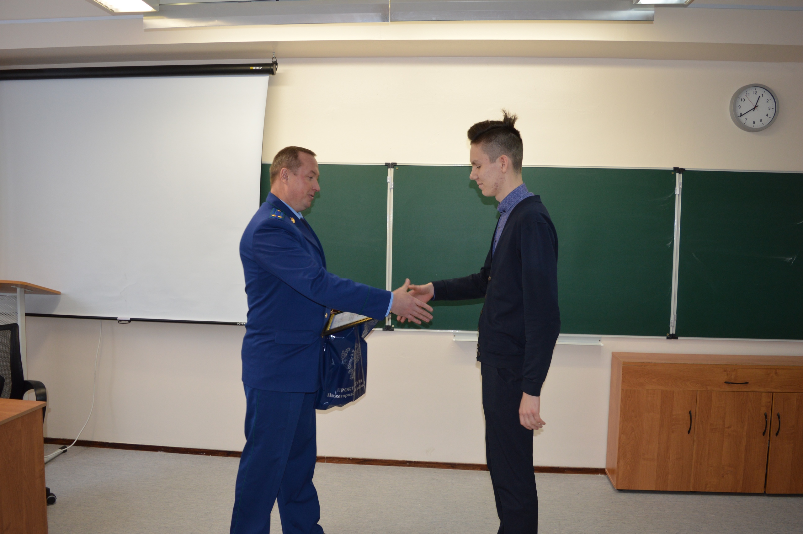 Прокурор Володарского района советник юстиции Смирнов В.А. поздравил призера интеллектуального соревнования, поблагодарил за участие в мероприятии и вручил памятные призы.