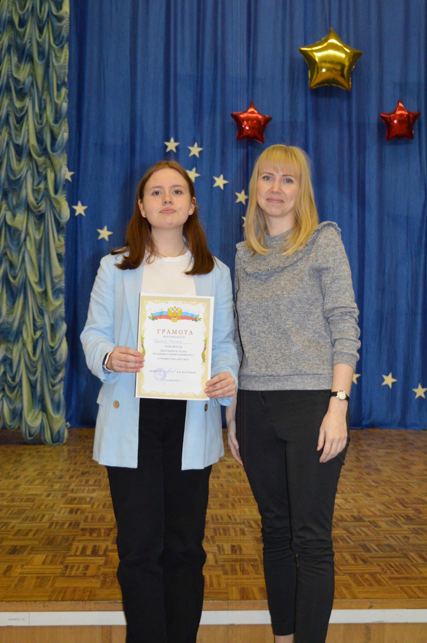 4-ое место занимает Ибрагимова Рамиля, 3-е место получает Прядилов Михаил, Соловьёв Никита становится серебряным призёром, а титул победителя школьного этапа муниципального конкурса «Ученик года» забирает Кузлякина Анастасия.