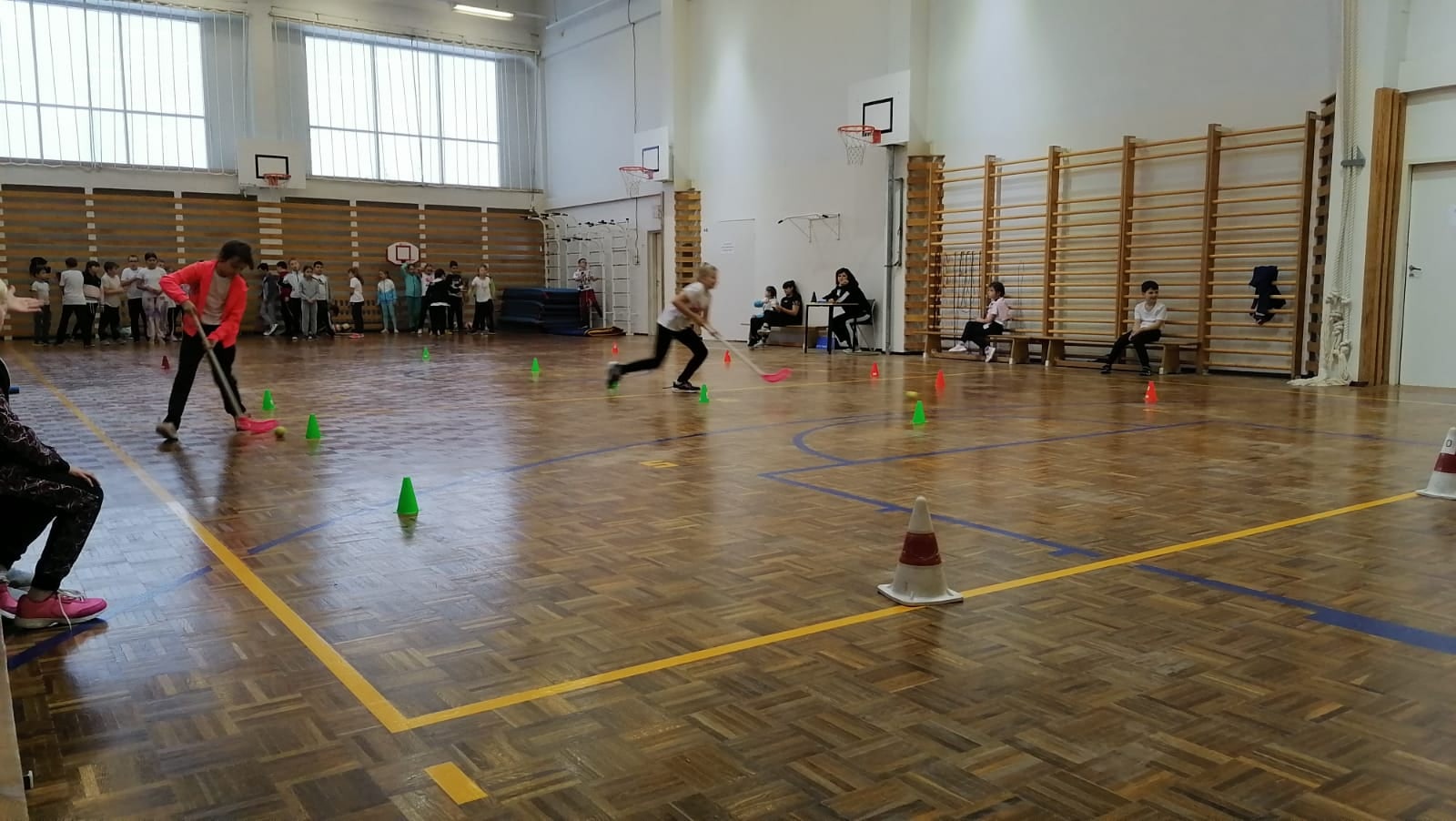 Было множество эстафет. Среди них: эстафеты с палочкой, прыжки на одной ноге с обручем, эстафета с мячиком и клюшкой, эстафета с карточками, где нужно было по очереди добежать до карточки с буквой, а потом все буквы сложить в одно слово.
