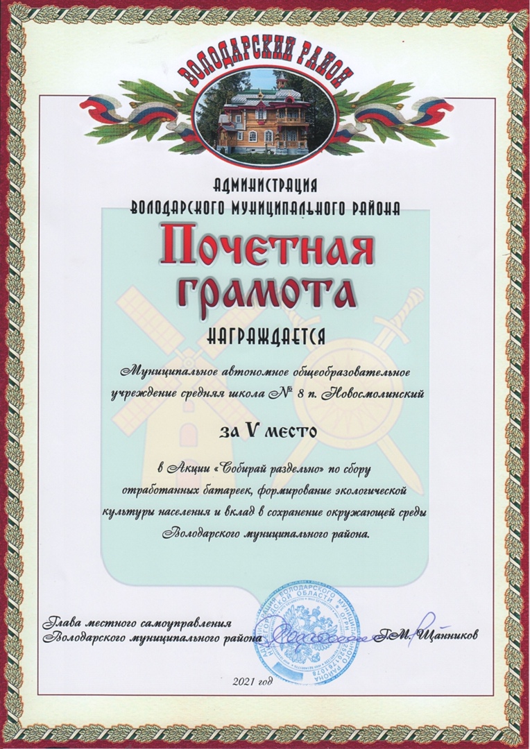 17 ноября 2021 года в администрации Володарского муниципального района Нижегородской области прошло награждение участников акции «Собирай раздельно», включающей в себя сбор отработанных батареек и крышечек. В акции приняла участие и наша школа. Из огромного количества участников, победители были выбраны на основе соотношения объема сданных для участия в акции батареек и крышечек к количеству обучающихся в учреждениях.