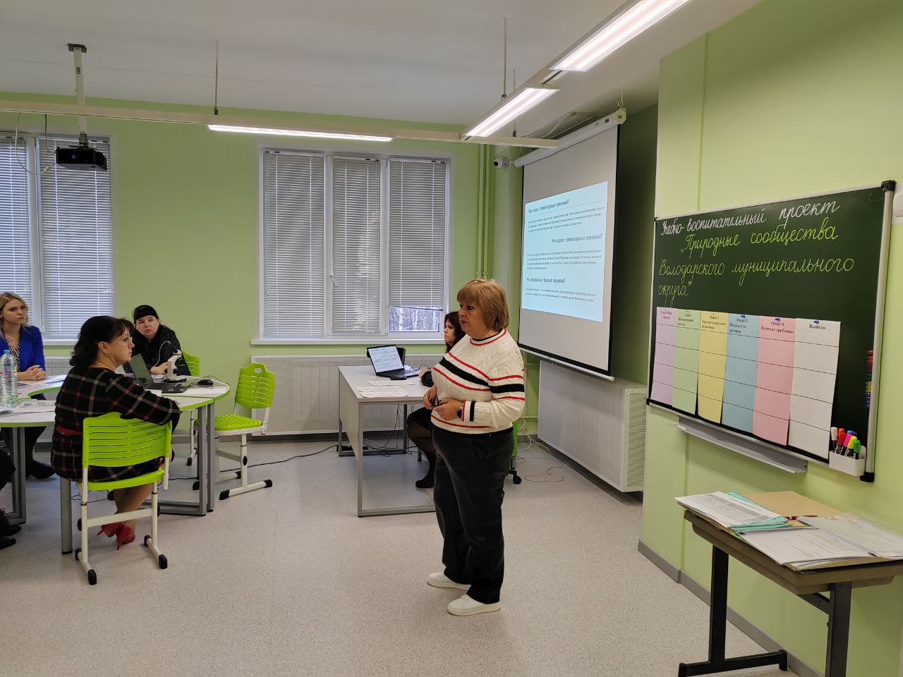 Семинар начался с приветственного слова директора МАОУ СШ №8 Ирины Владиславовны Васильевой и методиста ИДК управления образования администрации Володарского муниципального округа Власенко Т. Н. В своём вступительном докладе «Глобальные проблемы в контексте концепции «Планетарных границ» Ирина Владиславовна рассказала о современном подходе к образованию и воспитанию подрастающего поколения в условиях существующих вызовов современности.