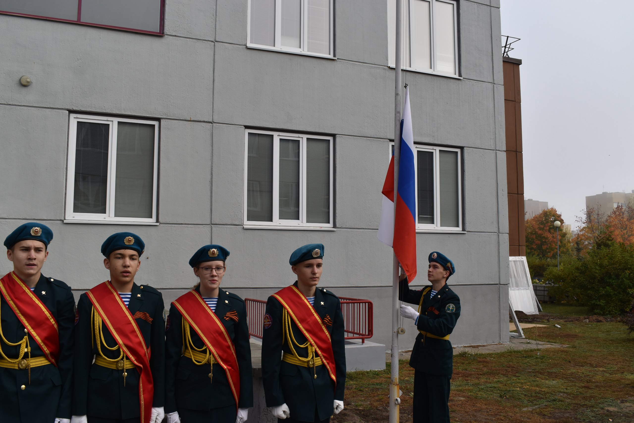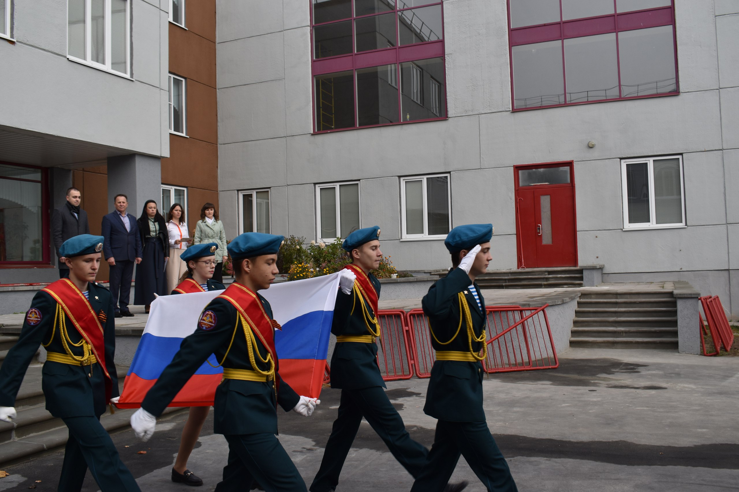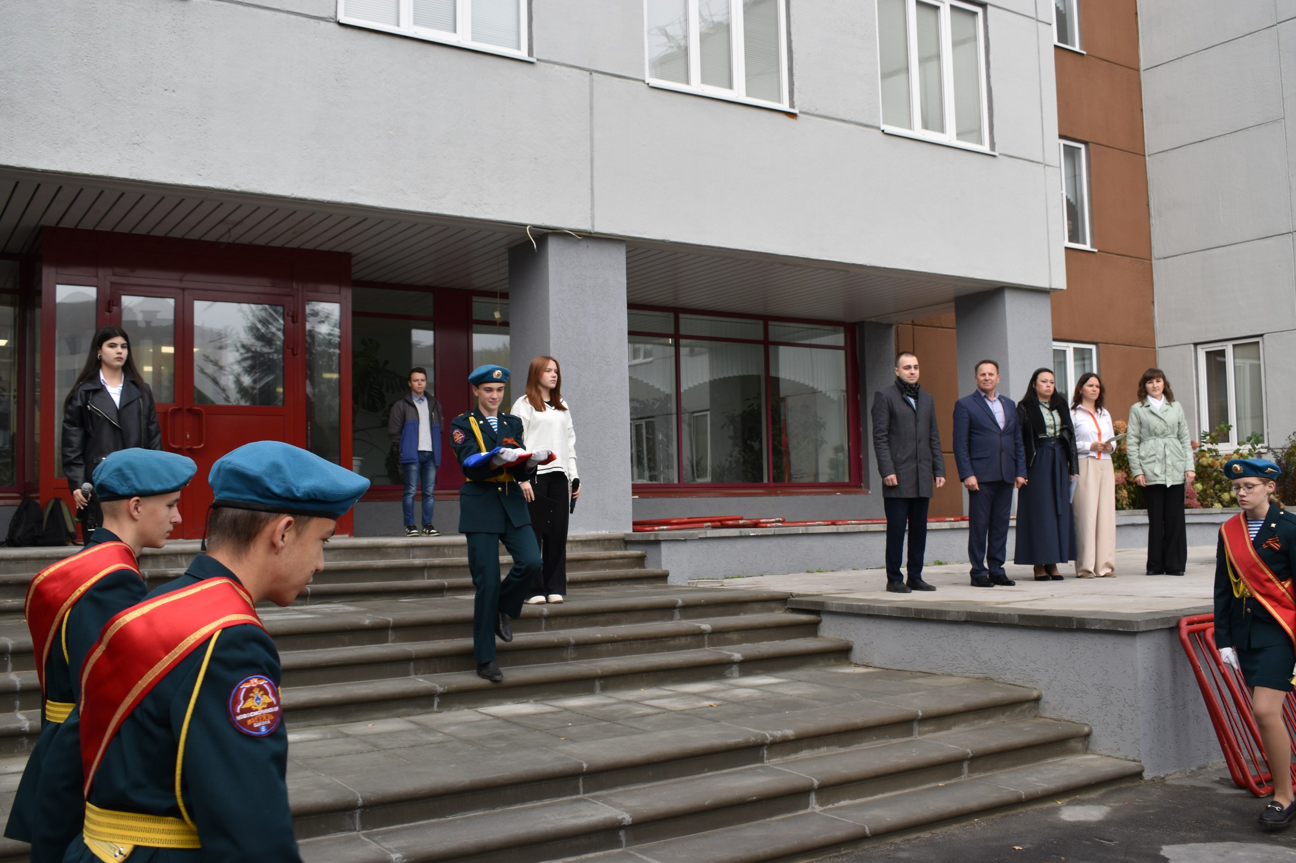 Торжественную линейку открыли воспитанники ВПО «Витязь», подняли флаг Российской Федерации, все ученики спели гимн страны.