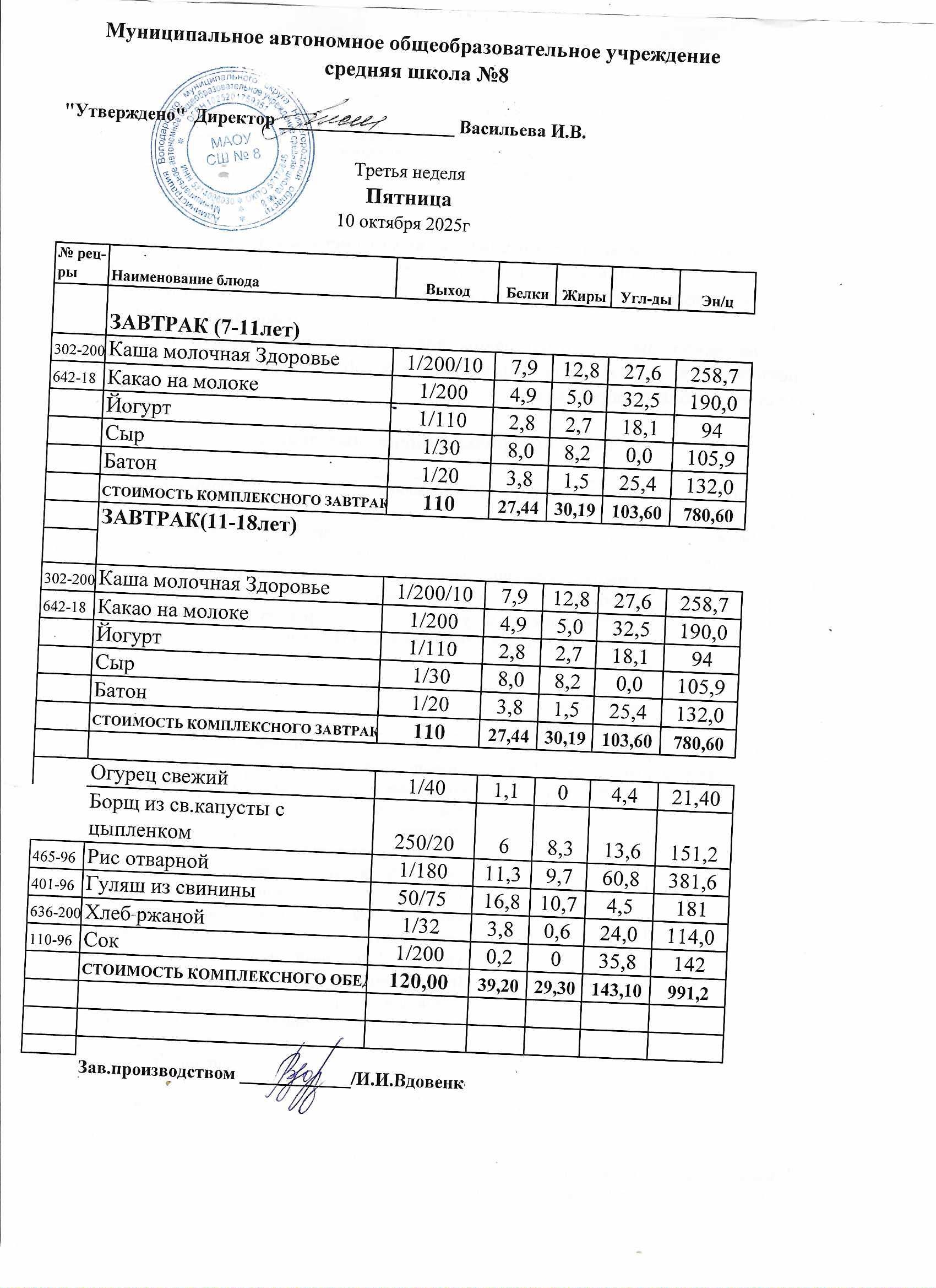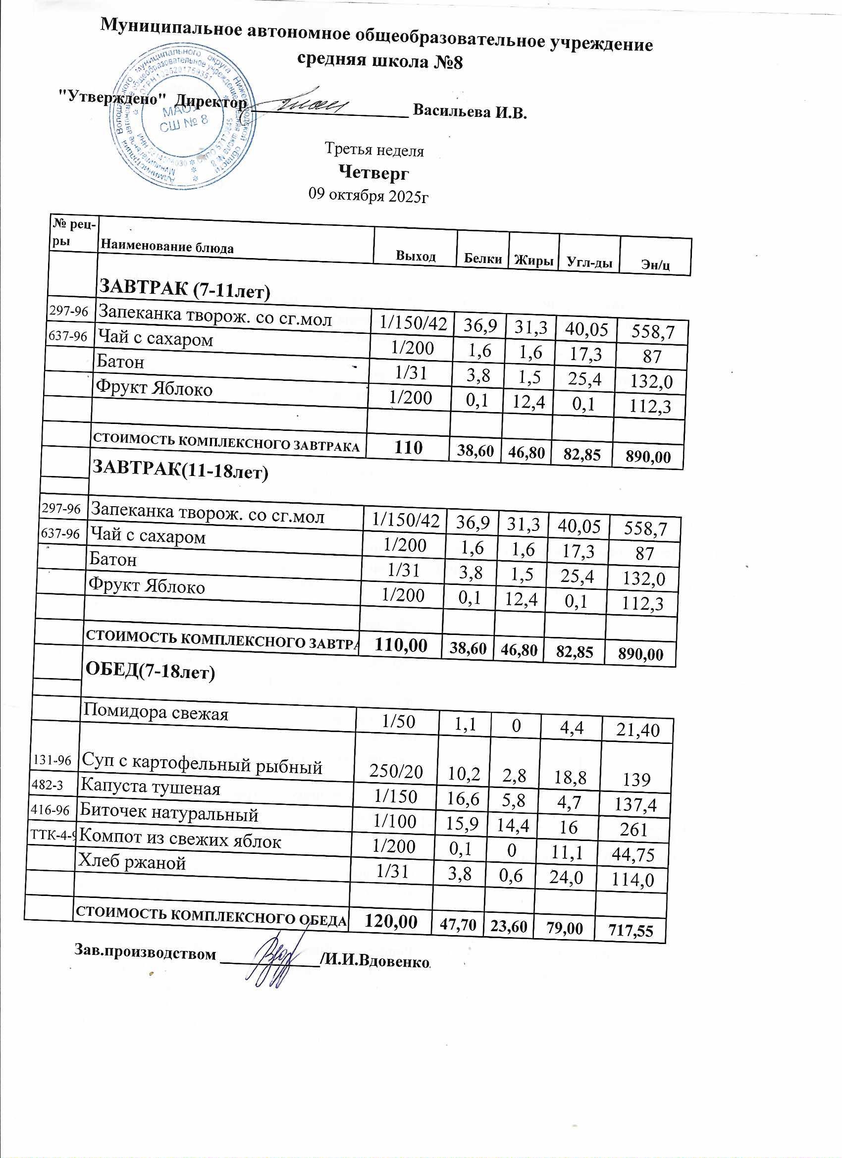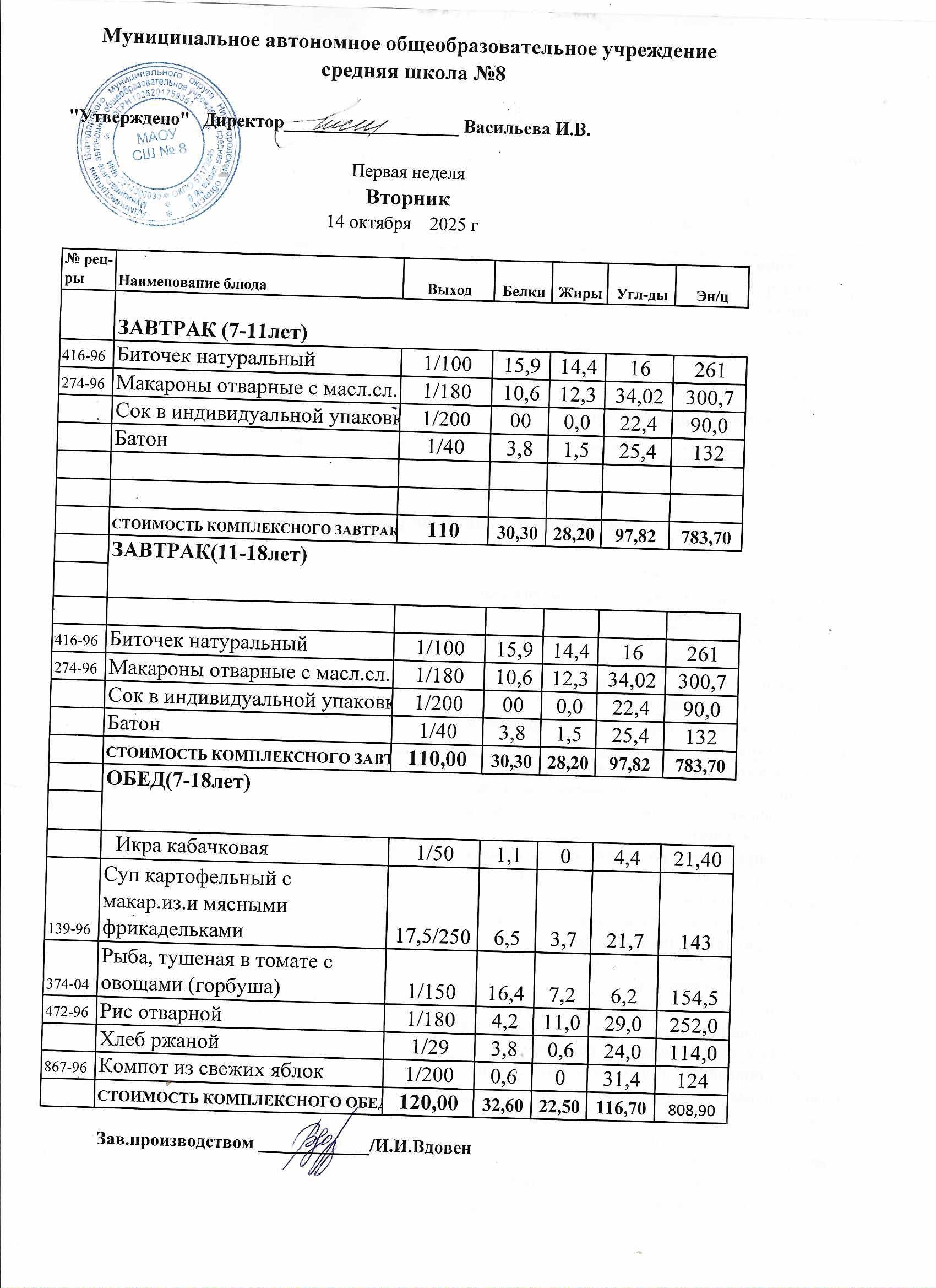 ПЯТНАДЦАТИДНЕВНОЕ ПРИМЕРНОЕ МЕНЮ для учащихся 7-11 лет МАОУ СШ № 8 на 2024 - 2025 учебный год - смотреть