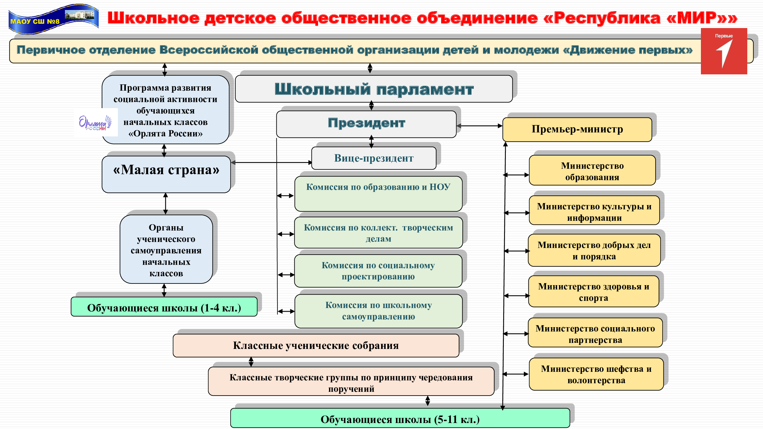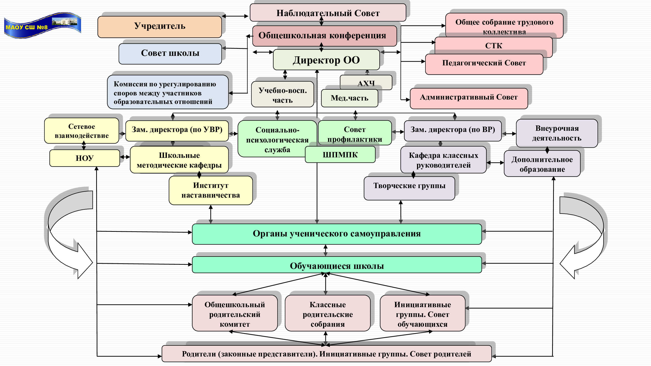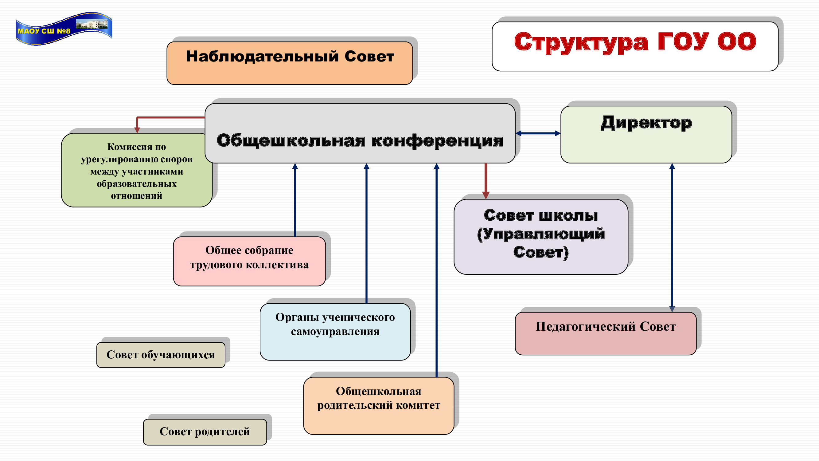 Единоличным исполнительным органом образовательной организации является руководитель образовательной организации - директор. Директор – Васильева Ирина Владиславовна, кабинет № 105 Телефон: (83136) 7-63-20 e-mail: mou48sosh@mail.ru Прием по личным вопросам: понедельник с 14.30 до 16.00 Коллегиальным органом управления образовательной организацией является Общее собрание работников образовательной организации Председатель Общего собрания работников – Толкачева Наталья Сергеевна, учитель. Общее собрание работников образовательной организации - постоянно действующий коллегиальный орган управления МАОУ СШ № 8. В компетенцию Общего собрания работников входит принятие решений по следующим вопросам: • Решение вопросов о необходимости регламентации локальными актами отдельных аспектов деятельности Учреждения; • Участие в разработке проектов локальных нормативных актов Учреждения, затрагивающих интересы работников, включая Правила внутреннего трудового распорядка Учреждения, Кодекс профессиональной этики педагогических работников Учреждения, Положения об оплате труда работников, Коллективного договора и др.; • Рассмотрение, обсуждение и рекомендация к утверждению проекта годового плана Учреждения, внесение предложений в план развития Учреждения, в т. ч. о направлениях образовательной деятельности и иных видах деятельности Учреждения; • Внесение предложений об изменении и дополнении Устава Учреждения; • Обсуждение вопросов состояния трудовой дисциплины в Учреждении и мероприятий по ее укреплению, рассмотрение фактов нарушения трудовой дисциплины работниками Учреждения; • Внесение предложений по вопросам охраны и безопасности условий организации образовательного процесса и трудовой деятельности, охраны жизни и здоровья участников образовательных отношений, организации питания обучающихся и работников Учреждения; • Внесение предложений по улучшению финансово-хозяйственной деятельности Учреждения; • Внесение предложений в пределах средств фонда оплаты труда Учреждения по порядку стимулирования труда работников образовательной организации; • Внесение предложений по порядку и условиям предоставления социальных гарантий и льгот в пределах компетенции Учреждения; • Заслушивание публичного доклада руководителя Учреждения, его обсуждение; • Заслушивание ежегодного отчета о поступлении и расходовании финансовых и материальных средств, его обсуждение; • Заслушивание отчета о результатах самообследования, его обсуждение; • Рассмотрение вопросов взаимодействия с государственными органами и органами местного самоуправления, относящимся к оптимизации деятельности Учреждения и повышения качества оказываемых образовательных услуг; • Внесение предложений по организации сотрудничества Учреждения с социальными партнерами, другими образовательными организациями в рамках сетевого взаимодействия. Коллегиальным органом управления образовательной организацией является Педагогический совет Председатель Педагогического совета - директор МАОУ СШ № 8 Васильева Ирина Владиславовна. Педагогический совет - постоянно действующий коллегиальный орган управления МАОУ СШ № 8. В состав Педагогического совета входят все педагогические работники школы. Педагогический совет рассматривает и принимает решения по следую