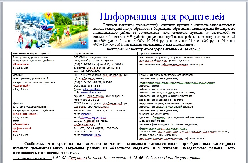 Детские санатории и санаторно-оздоровительные центры (лагеря) круглогодичного действия, расположенные на территории Нижегородской области (для самостоятельного приобретения путевки)