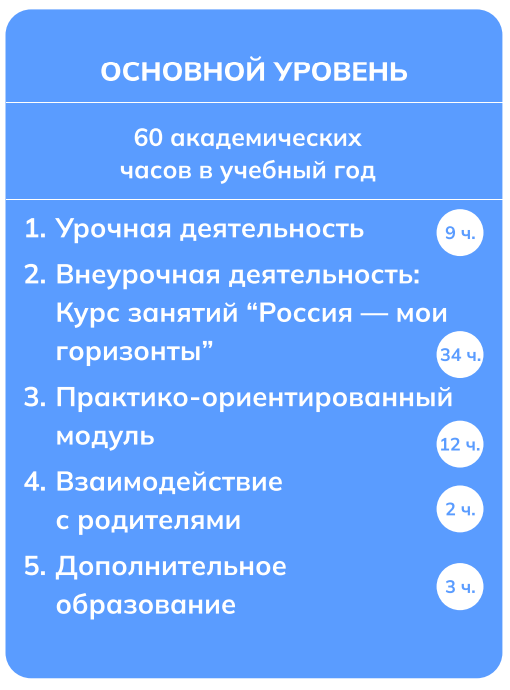 Профминимум предусматривает три уровня: базовый (не менее 40 часов в учебный год), основной (не менее 60 часов в учебный год), продвинутый (не менее 80 часов в учебный год). Выбор уровня Профминимума осуществляется образовательной организацией с учётом созданных для его реализации условий и утверждается региональным органом управления образованием.